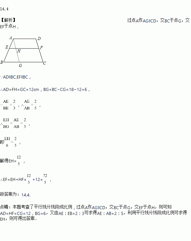 如图,梯形 ABCD中,AD∥BC∥EF, AE∶EB=2∶3, AD=12,则BC=18,则EF=____