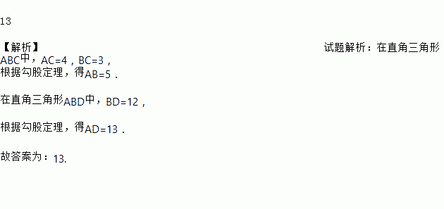 如图,∠C=∠ABD=90°,AC=4,BC=3,BD=12,则AD=_______.