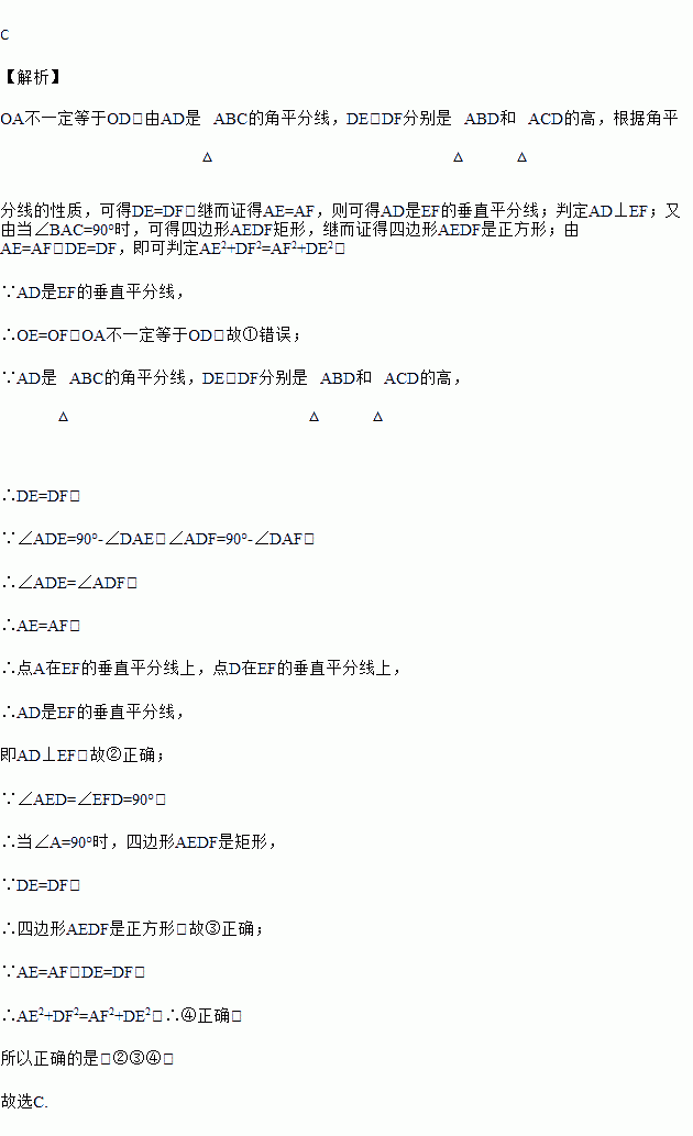 如图,AD是△ABC的角平分线,DE,DF分别是△ABD和△ACD的高,得到下面四个结论:①OA=OD;②AD⊥EF;③当∠BAC=90°时,四边形AEDF是正方形;④AE2+DF2=AF2+DE2.其中正确的是( )