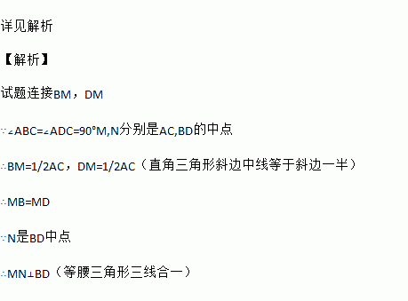 如图,在四边形ABCD中,∠ABC=∠ADC=90°,M、N分别是AC、BD的中点,试说明: