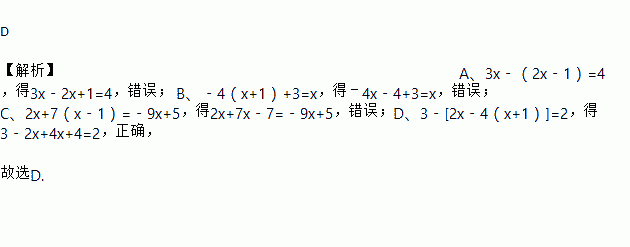 D 【解析】A、3x﹣(2x﹣1)=4,得3x﹣2x+1=4,错误; B、﹣4(x+1)+3=x,得﹣4x﹣4+3=x,错误;C、2x+7(x﹣1)=﹣9x+5,得2x+7x﹣7=﹣9x+5,错误;D、3﹣[2x﹣4(x+1)]=2,得3﹣2x+4x+4=2,正确, 故选D.