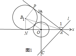 此时,直线l旋转到l1恰好与⊙B1第一次相切于点P,⊙B1与x轴相切于点N,连接B1O,B1N.