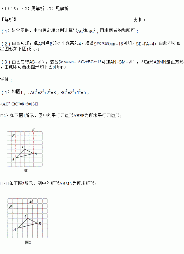 (3)请在如图所示的网格中,用无刻度的直尺,画出一个矩形ABMN,使得该矩形的面积等于AC2+BC2.