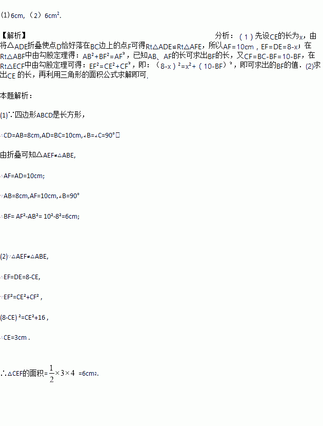 如图,已知长方形ABCD中AB=8cm,BC=10cm,在边CD上取一点E,将△ADE折叠使点D恰好落在BC边上的点F,求(1)求BF的长度,(2)求△CEF的面积.