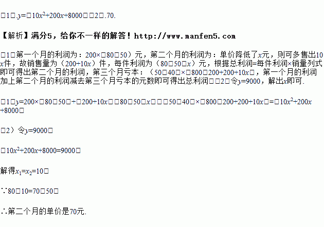 ijÅú·¢ÉÌÒÔÿ¼þ50ÔªµÄ¼Û¸ñ¹º½ø800¼þTÐô£®µÚÒ»¸öÔÂÒÔµ¥¼Û80ÔªÏúÊÛ£¬ÊÛ³öÁË200¼þ£»µÚ¶þ¸öÔÂÈç¹ûµ¥¼Û²»±ä£¬Ô¤¼ÆÈÔ¿ÉÊÛ³ö200¼þ£¬Åú·¢ÉÌΪÔö¼ÓÏúÊÛÁ¿£¬¾ö¶¨½µ¼ÛÏúÊÛ£¬¸ù¾ÝÊг¡µ÷²é£¬µ¥¼Ûÿ½µµÍ1Ôª£¬¿É¶àÊÛ³ö10¼þ£¬µ«×îµÍµ¥¼ÛÓ¦¸ßÓÚ¹º½øµÄ¼Û¸ñ£»µÚ¶þ¸öÔ½áÊøºó£¬Åú·¢É̽«¶ÔÊ£ÓàµÄTÐôÒ»´ÎÐÔÇå²Ö£¬Çå²Öʱµ¥¼ÛΪ40Ôª£®ÉèµÚ¶þ¸öÔµ¥¼Û½µµÍxÔª£¬ÕâÅúTÐô×ÜÀûÈóΪyÔª£®