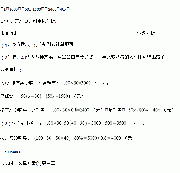 (1)3000,(50x-1500),2400,40x; (2)选方案①,利用见解析. 【解析】试题分析: (1)按方案①、②分别列式计算即可; (2)把x=40代入两种方案计算出各自需要的费用,再比较两者的大小即可得出结论. 试题解析: (1)按方案①购买:篮球需: (元), 足球需: (元); 按方案②购买:篮球需: (元),足球需: (元); ...