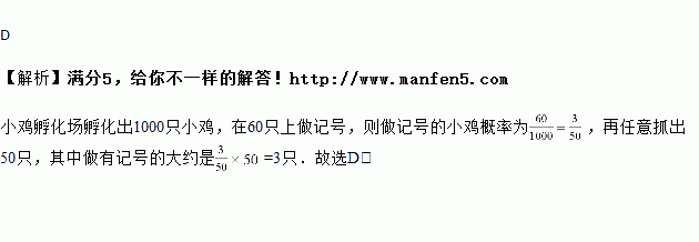 小鸡孵化场孵化出1000只小鸡,在60只上做记号,再放入鸡群中让其充分跑散,再任意抓出50只,其中做有记号的大约是( )