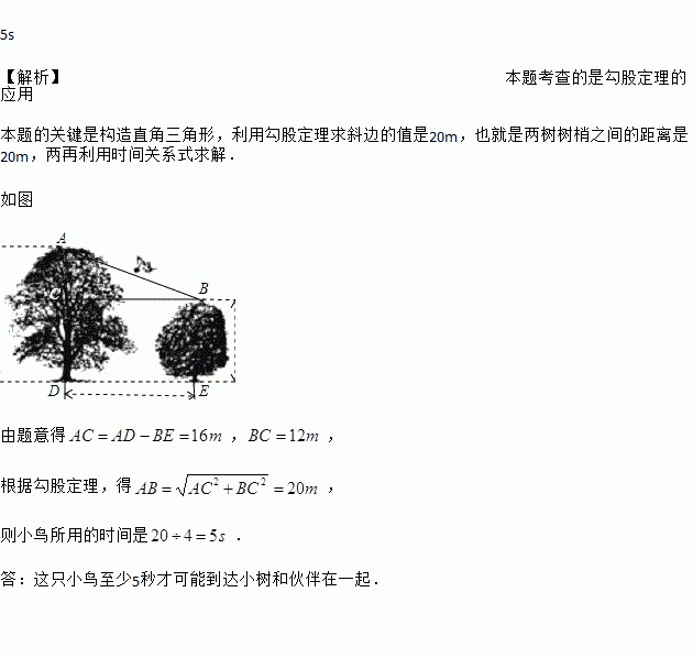 有一只小鸟在一棵高4m的小树梢上捉虫子,它的伙伴在离该树12m,高20m的一棵大树的树梢上发出友好的叫声,它立刻以4m/s的速度飞向大树树梢,那么这只小鸟至少几秒才可能到达大树和伙伴在一起?