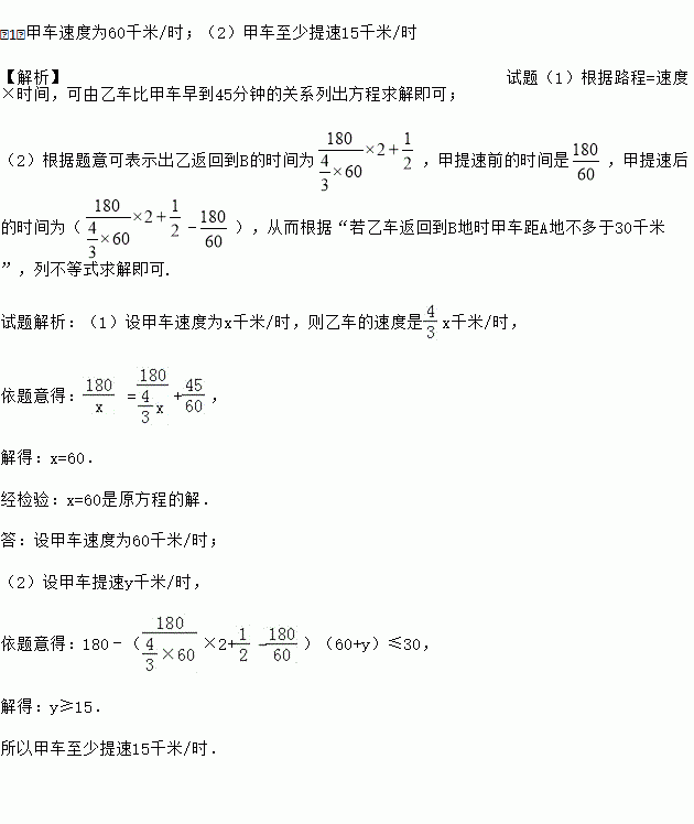 (2)乙车到达A地停留半小时后以来A地时的速度匀速返回B地,甲车到达B地后立即提速匀速返回A地,若乙车返回到B地时甲车距A地不多于30千米,求甲车至少提速多少千米/时?