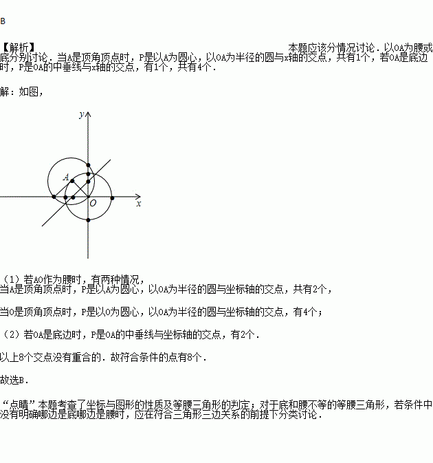 在直角坐标系中,O为坐标原点,已知A(-1,1),在坐标轴上确定点P,使△AOP为等腰三角形,则符合条件的点P的个数共有( )
