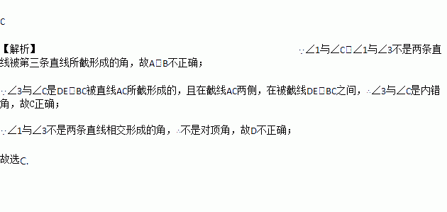 C. ∠3与∠C是内错角 D. ∠1与∠3是对顶角