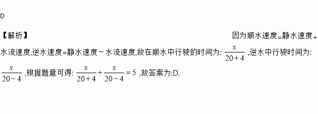 ÂÖ´¬ÔÚ¾²Ë®ÖеÄËÙ¶ÈΪ20 km/h£¬Ë®Á÷ËÙ¶ÈΪ4 km/h£¬´Ó¼×Âëͷ˳Á÷º½Ðе½ÒÒÂëÍ·£¬ÔÙ·µ»Ø¼×ÂëÍ·£¬¹²ÓÃ5 h£¨²»¼ÆÍ£Áôʱ¼ä£©£¬Çó¼×¡¢ÒÒÁ½ÂëÍ·¼äµÄ¾àÀë. Éè¼×¡¢ÒÒÁ½ÂëÍ·¼äµÄ¾àÀëΪx km/h£¬ÔòÁгöµÄ·½³ÌÕýÈ·µÄÊÇ£¨ £©