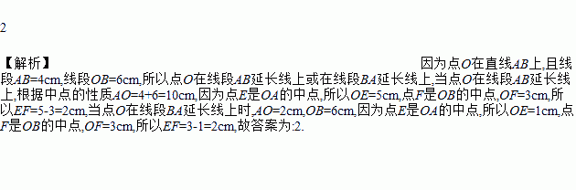 2 【解析】因为点O在直线AB上,且线段AB=4cm,线段OB=6cm,所以点O在线段AB延长线上或在线段BA延长线上,当点O在线段AB延长线上,根据中点的性质AO=4+6=10cm,因为点E是OA的中点,所以OE=5cm,点F是OB的中点,OF=3cm,所以EF=5-3=2cm,当点O在线段BA延长线上时,AO=2cm,OB=6cm,因为点E是OA的中点,所以OE=1cm,点F是OB的中点...