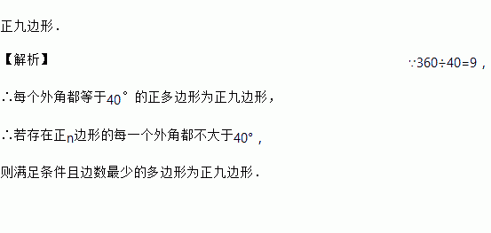 正九边形. 【解析】∵360÷40=9, ∴每个外角都等于40°的正多边形为正九边形, ∴若存在正n边形的每一个外角都不大于40°, 则满足条件且边数最少的多边形为正九边形.