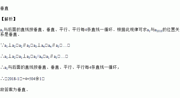 在同一平面内有2018条直线a1,a2,…,a2018,如果a1⊥a2,a2∥a3,a3⊥a4,a4∥a5,…,那么a1与a2018的位置关系是________