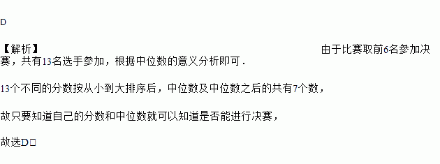 某校田径运动会有13名同学参加女子百米赛跑,她们预赛的成绩各不相同,取前6名参加决赛,小玥已经知道了自己的成绩,她想知道自己能否进入决赛,还需要知道这13名同学成绩的( )