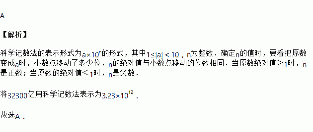 据福建省统计局核算,2017年全省实现生产总值约32300亿元,居全国第七位;用科学记数法表示32300亿,其结果是