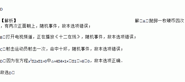 D 【解析】解:A.抛掷一枚硬币四次,有两次正面朝上,随机事件,故本选项错误; B.打开电视频道,正在播放《十二在线》,随机事件,故本选项错误; C.射击运动员射击一次,命中十环,随机事件,故本选项错误; D.因为在方程x2﹣2x﹣1=0中△=4﹣4×1×(﹣1)=8>0,故本选项正确. 故选D.