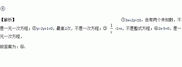 下列方程中:①3x+2y=10;②y2-2y+1=0;③ -1=x;④2x-5=0,为一元一次方程的是________ (填序号).