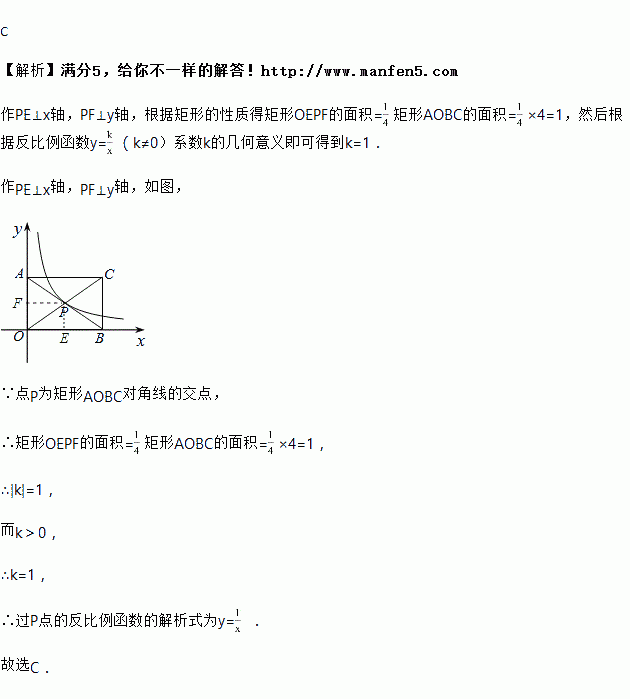 如图,矩形AOBC的面积为4,反比例函数y=的图象的一支经过矩形对角线的交点P,则k的值是( )
