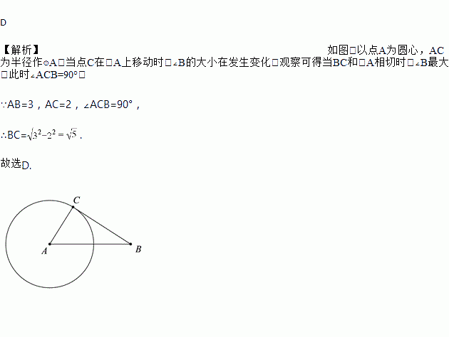 如图,在△ABC中, AB=3,AC=2.当∠B最大时,BC的长是( )