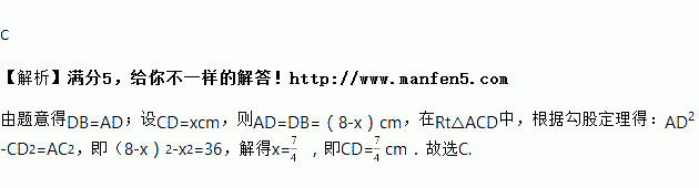 如图,有一张直角三角形纸片,两直角边AC=6cm,BC=8cm,将△ABC折叠,使点B与点A重合,折痕为DE,则CD等于( )