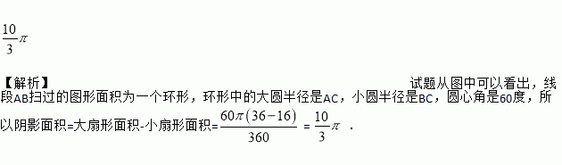 如图,将△ABC绕点C旋转60°得到△A′B′C′,已知AC=6,BC=4,则线段AB扫过图形(阴影部分)的面积为______________(结果保留π).