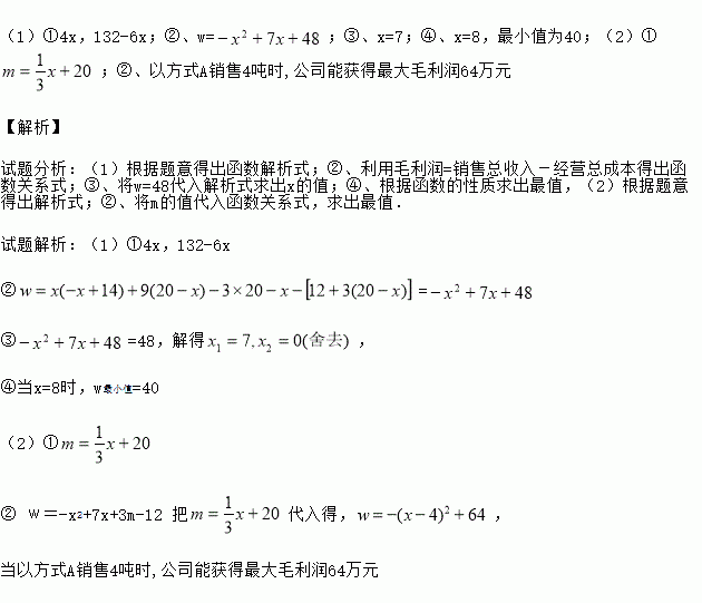 (1)①4x,132-6x;②、w=;③、x=7;④、x=8,最小值为40;(2)①;②、以方式A销售4吨时,公司能获得最大毛利润64万元 【解析】 试题分析:(1)根据题意得出函数解析式;②、利用毛利润=销售总收入-经营总成本得出函数关系式;③、将w=48代入解析式求出x的值;④、根据函数的性质求出最值,(2)根据题意得出解析式;②、将m的值代入函数关系式,求出最值. 试题解析...