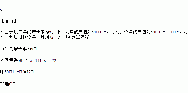 某厂前年的产值为50万元,今年上升到72万元,这两年的平均增长率是多少?若设每年的增长率为x,则有方程( )