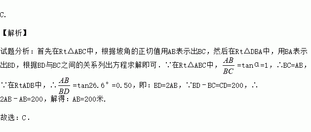 如图,小山岗的斜坡AC的坡角α=45°,在与山脚C距离200米的D处,测得山顶A的仰角为26.6°,小山岗的高AB约为( ).(结果取整数,参考数据:sin26.6°=0.45,cos26.6°=0.89,tan26.6°=0.50)