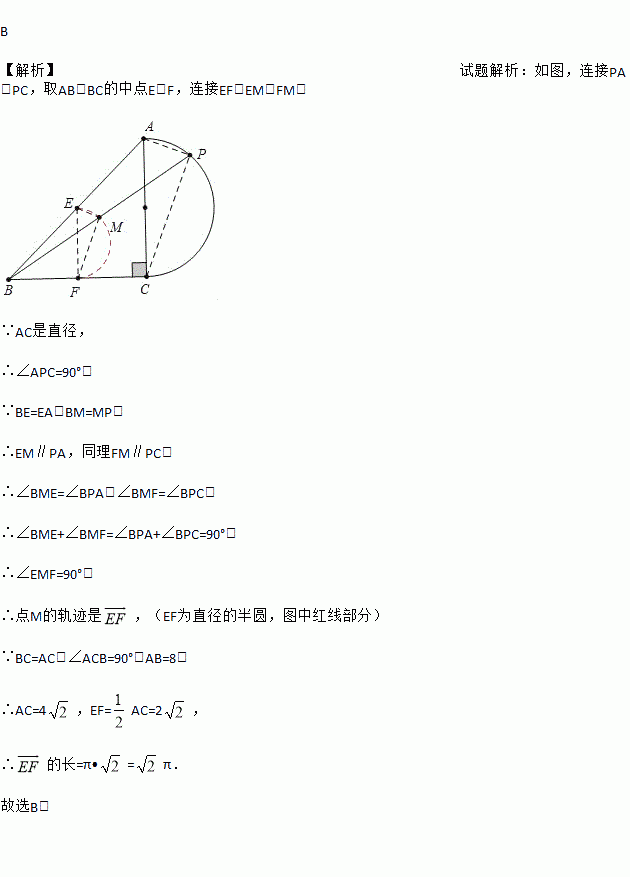 如图,在等腰Rt△ABC中,斜边AB=8,点P在以AC为直径的半圆上,M为PB的中点,当点P沿半圆从点A运动至点C时,点M运动的路径长是( )