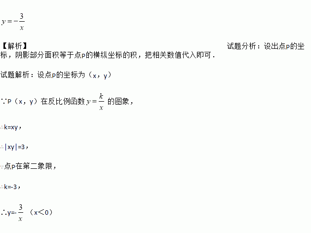 如图,点P是反比例函数图象上的一点,过点P分别向轴、轴作垂线,若阴影部分面积为3,则这个反比例函数的关系式是_____________.
