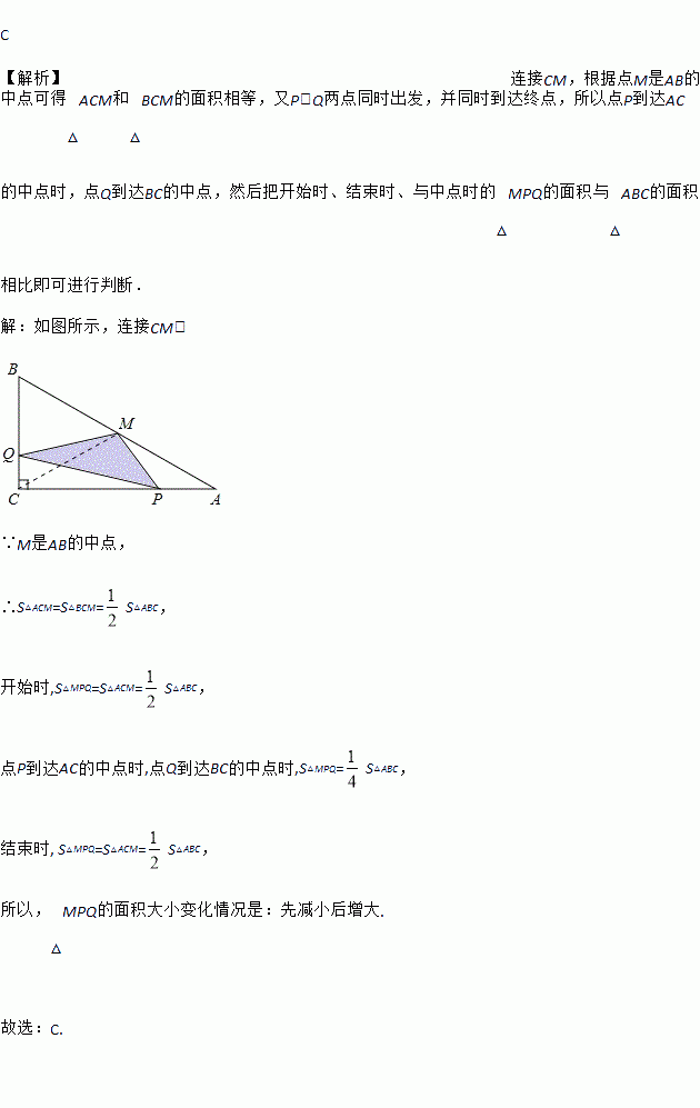 如图,在△ABC中,∠C=90°,M是AB的中点,动点P从点A出发,沿AC方向匀速运动到终点C,动点Q从点C出发,沿CB方向匀速运动到终点B.已知P,Q两点同时出发,并同时到达终点,连接MP,MQ,PQ.在整个运动过程中,△MPQ的面积大小变化情况是( )
