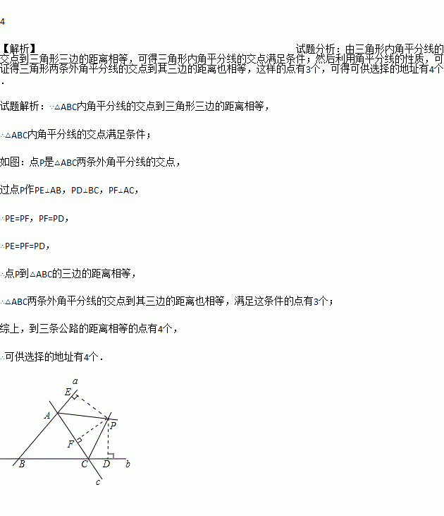 如图,直线a、b、c表示三条公路,现要建一个货物中转站,要求它到三条公路的距离相等,则可供选择的地址有_______处.