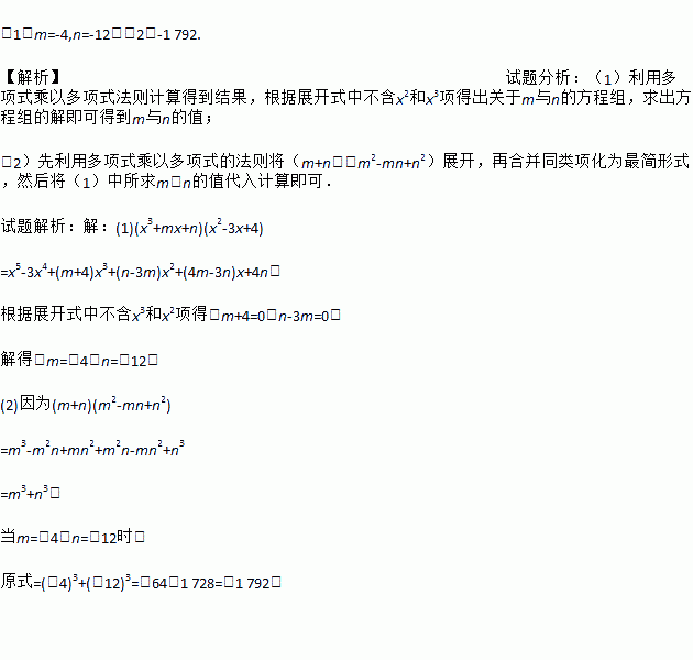(1)m=-4,n=-12;(2)-1 792. 【解析】试题分析:(1)利用多项式乘以多项式法则计算得到结果,根据展开式中不含x2和x3项得出关于m与n的方程组,求出方程组的解即可得到m与n的值; (2)先利用多项式乘以多项式的法则将(m+n)(m2-mn+n2)展开,再合并同类项化为最简形式,然后将(1)中所求m、n的值代入计算即可. 试题解析:【解析】 (1)(x3+mx...