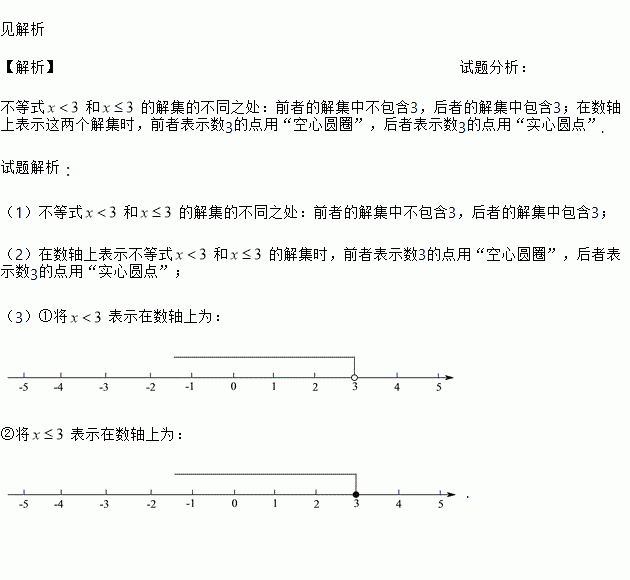 不等式的解集x<3与x≤3有什么不同?在数轴上表示它们时怎样区别?分别在数轴上把这两个解集表示出来.