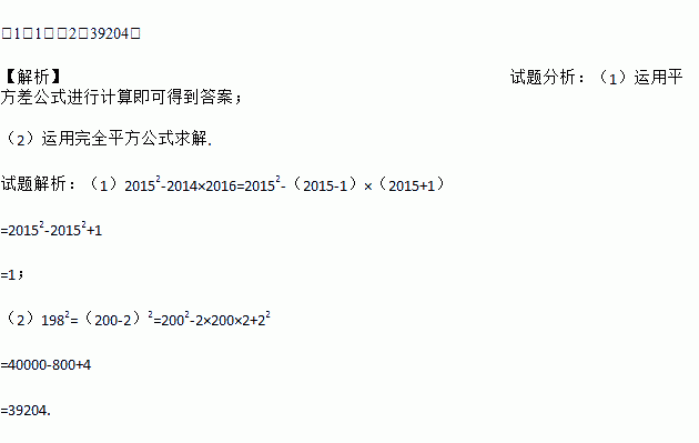 (1)1;(2)39204. 【解析】试题分析:(1)运用平方差公式进行计算即可得到答案; (2)运用完全平方公式求解. 试题解析:(1)20152-2014×2016=20152-(2015-1)×(2015+1) =20152-20152+1 =1; (2)1982=(200-2)2=2002-2×200×2+22 =40000-800+4 =3...