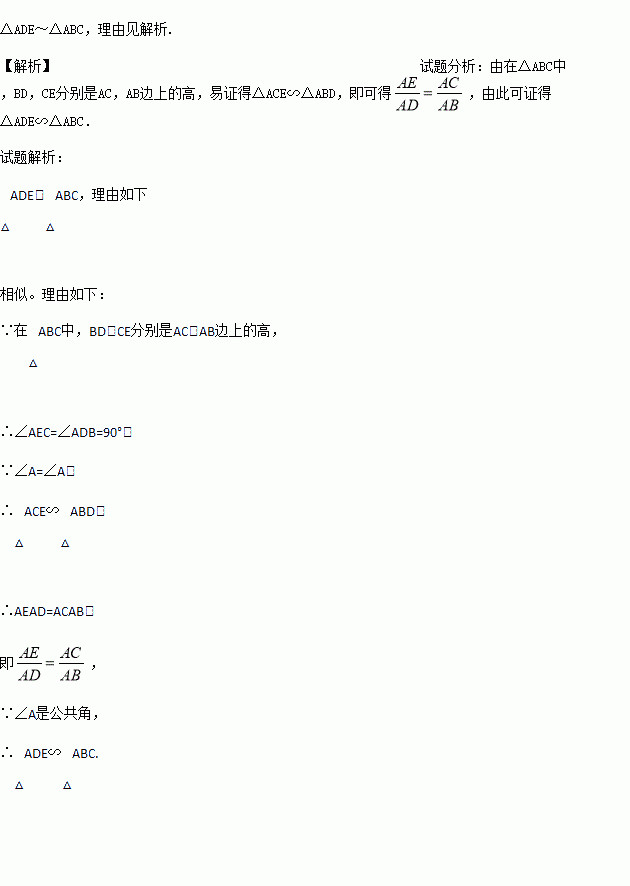 如图,在△ABC中,BD⊥AC,CE⊥AB,垂足分别为D、E,连接DE,试判断△ADE与△ABC是否相似,并说明理由?