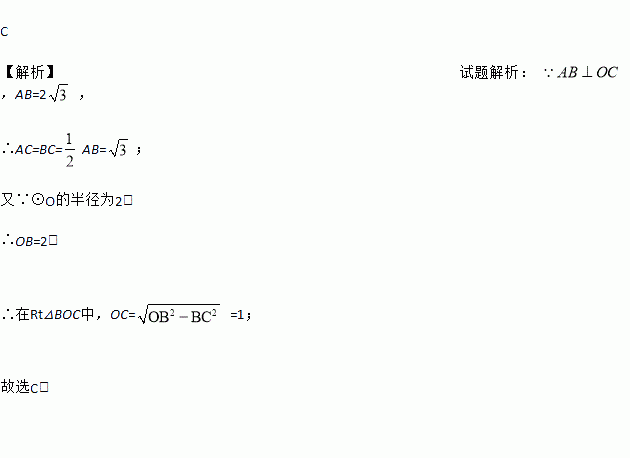 如图,⊙O的半径为2,弦AB⊥OC于C,AB=,则OC等于( )