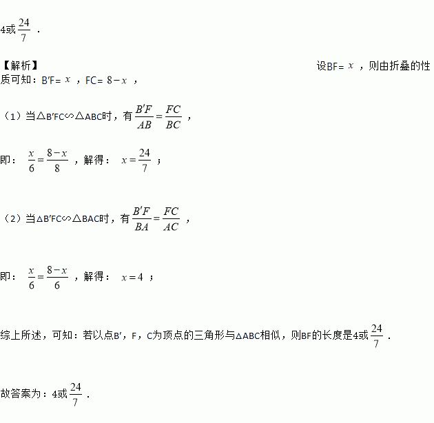 将三角形纸片(△ABC)按如图所示的方式折叠,使点B落在边AC上,记为点B′,折痕为EF.已知AB=AC=6,BC=8.若以点B′,F,C为顶点的三角形与△ABC相似,则BF的长度是______