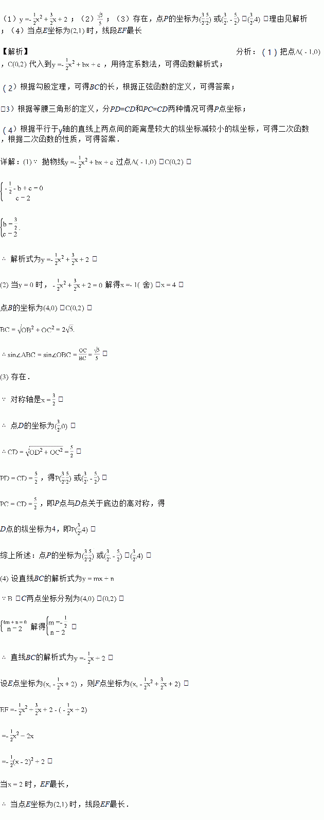 点E是线段BC上的一个动点,过点E作x轴的垂线与抛物线相交于点F,当点E运动到什么位置时线段EF最长?求出此时E点的坐标.![]()