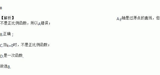 B 【解析】A.y轴是过原点的直线,但不是正比例函数,所以A错误; B.正确; C.当k=0时,不是正比例函数; D.是一次函数. 故选B.