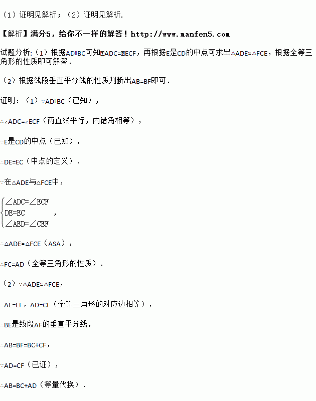 如图所示,在四边形ABCD中,AD∥BC,E为CD的中点,连接AE、BE,BE⊥AE,延长AE交BC的延长线于点F.求证:(1)FC=AD;(2)AB=BC+AD.