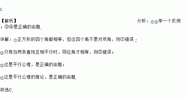 下列语句:①相等的角是对顶角;②如果两条直线被第三条直线所截,那么同位角相等;③过直线外一点有且只有一条直线与已知直线平行;④如果两条直线都与第三条直线平行,那么这两条直线也互相平行.其中正确的命题是( )