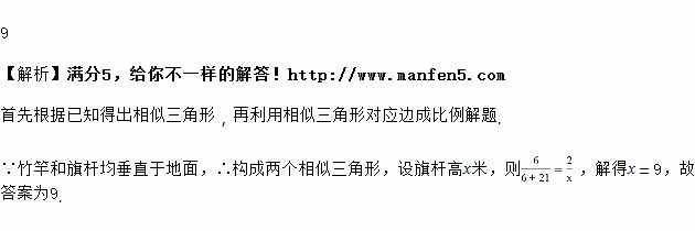 如图,为测量学校旗杆的高度,小东用长为的竹竿做测量工具,移动竹竿、旗杆顶端的影子恰好落在地面的同一点,此时,竹竿与这一点相距,与旗杆相距,则旗杆的高为________.