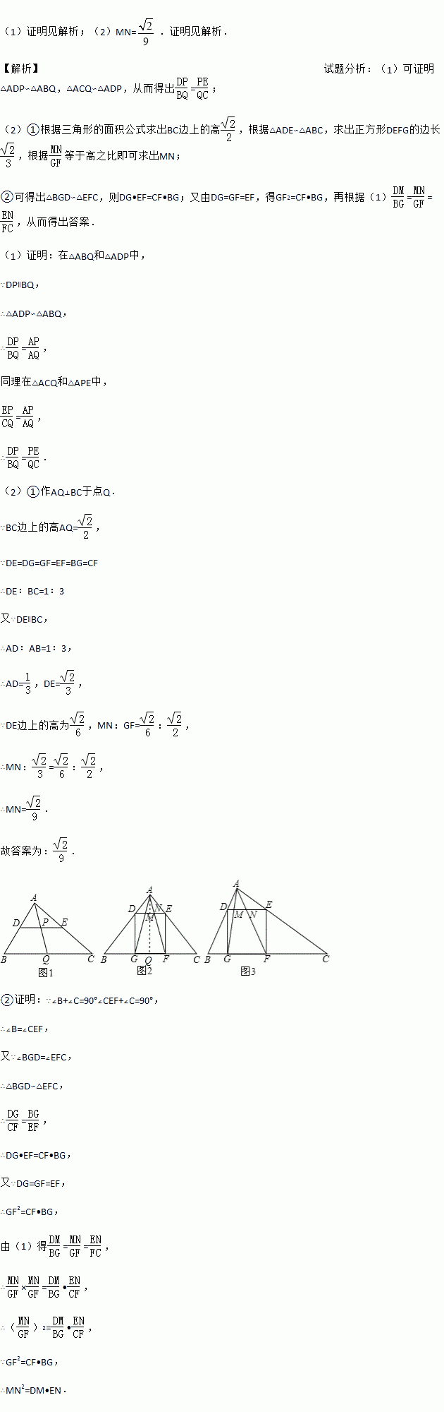 (1)如图1,在△ABC中,点D、E、Q分别在AB、AC、BC上,且DE∥BC,AQ交DE于点P,求证: