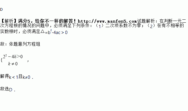 关于 x 的一元二次方程 kx 2 +2 x +1=0有两个不相等的实数根,则 k 的取值范围是( ).