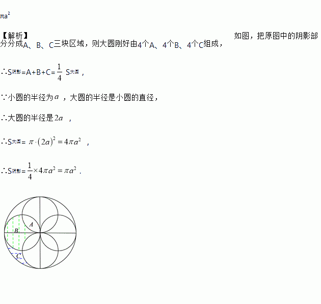 查看答案如图,一个大圆和四个面积相等的小圆,已知大圆半径等于小圆直径,小圆半径为a厘米,那么阴影部分的面积为_____平方厘米.