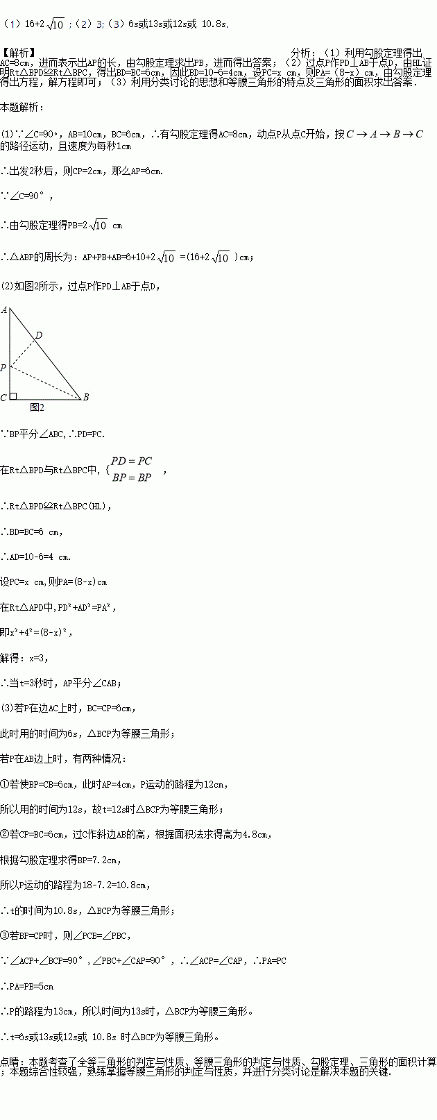 如图,△ABC中,∠C=90°,AB=10cm,BC=6cm,若动点P从点C开始,按C→A→B→C