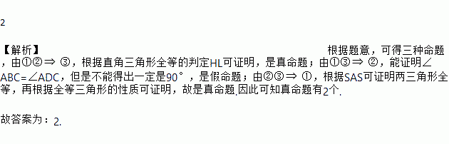 如图,在△ABC和△ADC中,下列论断:①AB=AD;②∠ABC=∠ADC=90°;③BC=DC.把其中两个论断作为条件,另一个论断作为结论,可以写出_个真命题.